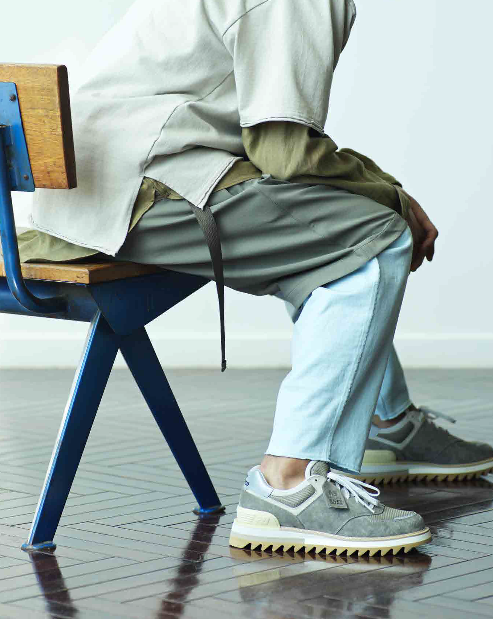 ちなみに先述のTDS574 は、New Balance で最も定番の574 をTDSらしく解釈したモデルだ。ビブラムのシャークソールを採用し、革靴のようなルックスを実現する一方で、スニーカー本来の履き心地は保持。N マーク代わりにタンラベルのデザインをタグにして配したり、チップ(つま先)・サドル(甲)・フォクシング(かかと)という574 オリジナルの特徴を残すことで、NロゴなしでもNew Balanceと分かるアレンジとなっている。574 を代表するグレーとカットソーとの配色の心地よさは、スタイリングを見れば一目瞭然だ。「個人的には、特にパンツがいいと思っています。ヘビーウェイトで膝が出にくく、洗濯してもへたらないですし、テーパードシルエットだからゆとりのあるスラックスという感覚。スニーカーとは色だけでなく形や丈のバランスもいいので、普段のパンツ代わりに履いてもらえると思います」